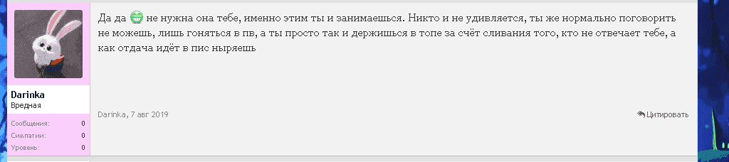 Darinka, В подобных случаях лучше промолчать.... Во-первых это гооаздо умнее поступок, нежели пускаться в срач, во-вторых какой смысл кормить тролля?