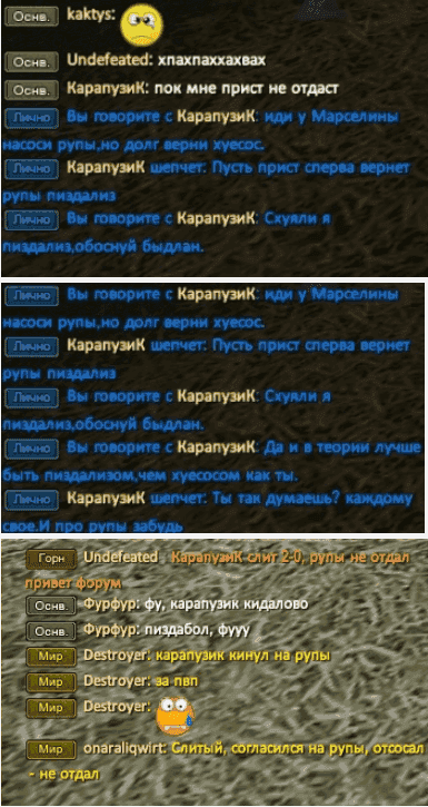 දඩයමක්, у него просто пригарает так что он высрал даже вот такую тему https://pwpvp.net/forum/threads/7404/ когда его возлюбленный мастер клана фалосов тоже держал пол карты твмодным кланом, многим тоже это не нравилось, но никто подобных высеров не пичатал) а действовали, играли как выигрывали так и проигрывали))